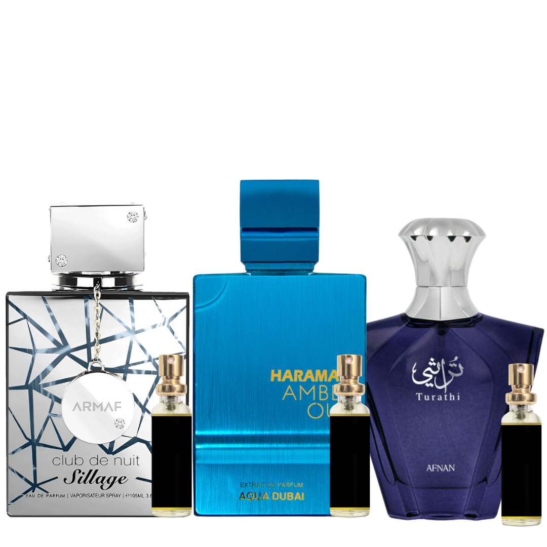 OBS: O combo sempre inclui 3 frascos referente a quantidade de MLs que você escolher, um de cada perfume do combo. Podendo ser 3 de 2ml, 3 de 5ml ou 3 de 8ml
