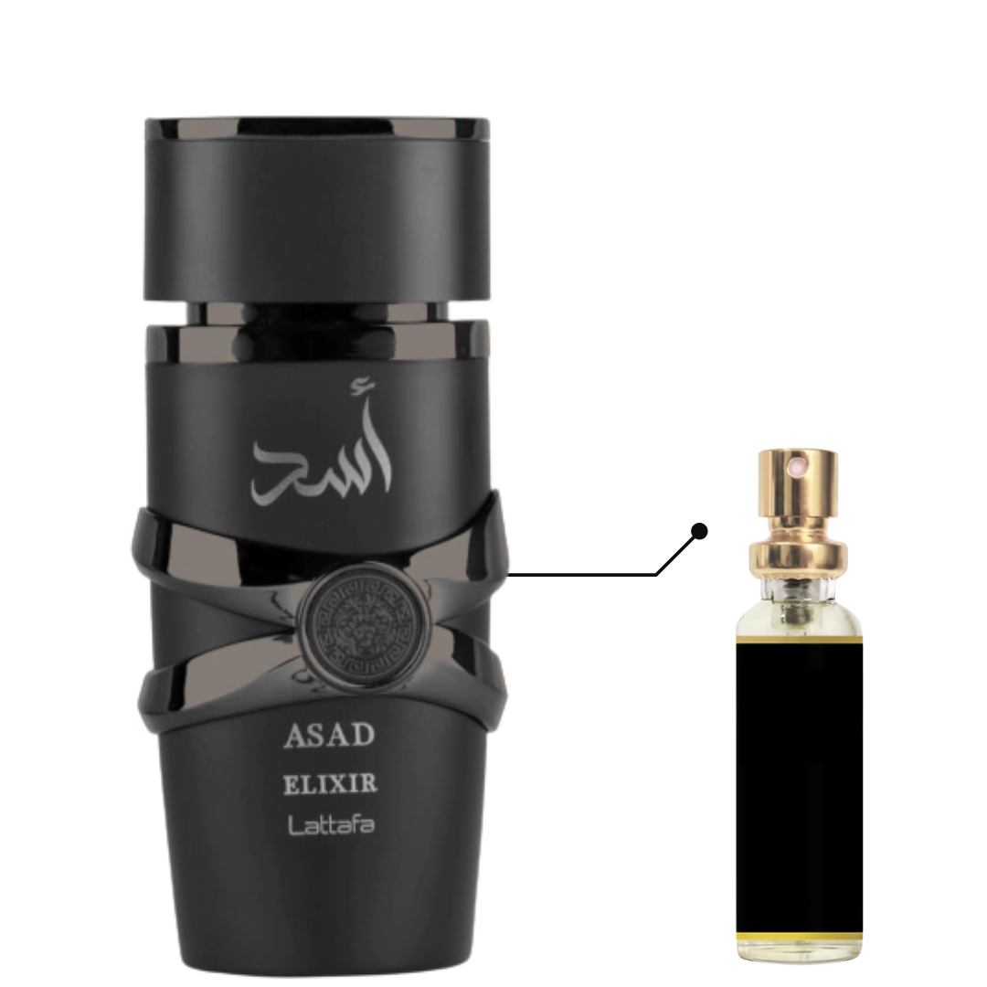 Asad Elixir de Lattafa Perfumes é um perfume Oriental Masculino. Esta é uma nova fragrância. Asad Elixir foi lançada em 2025. As notas de topo são: Açafrão, Toranja e Pimenta Rosa. As notas de coração são: Tabaco, Cedro e Baunilha. As notas de fundo são: Âmbar Claro, Olíbano, Patchouli e Cashmeran.