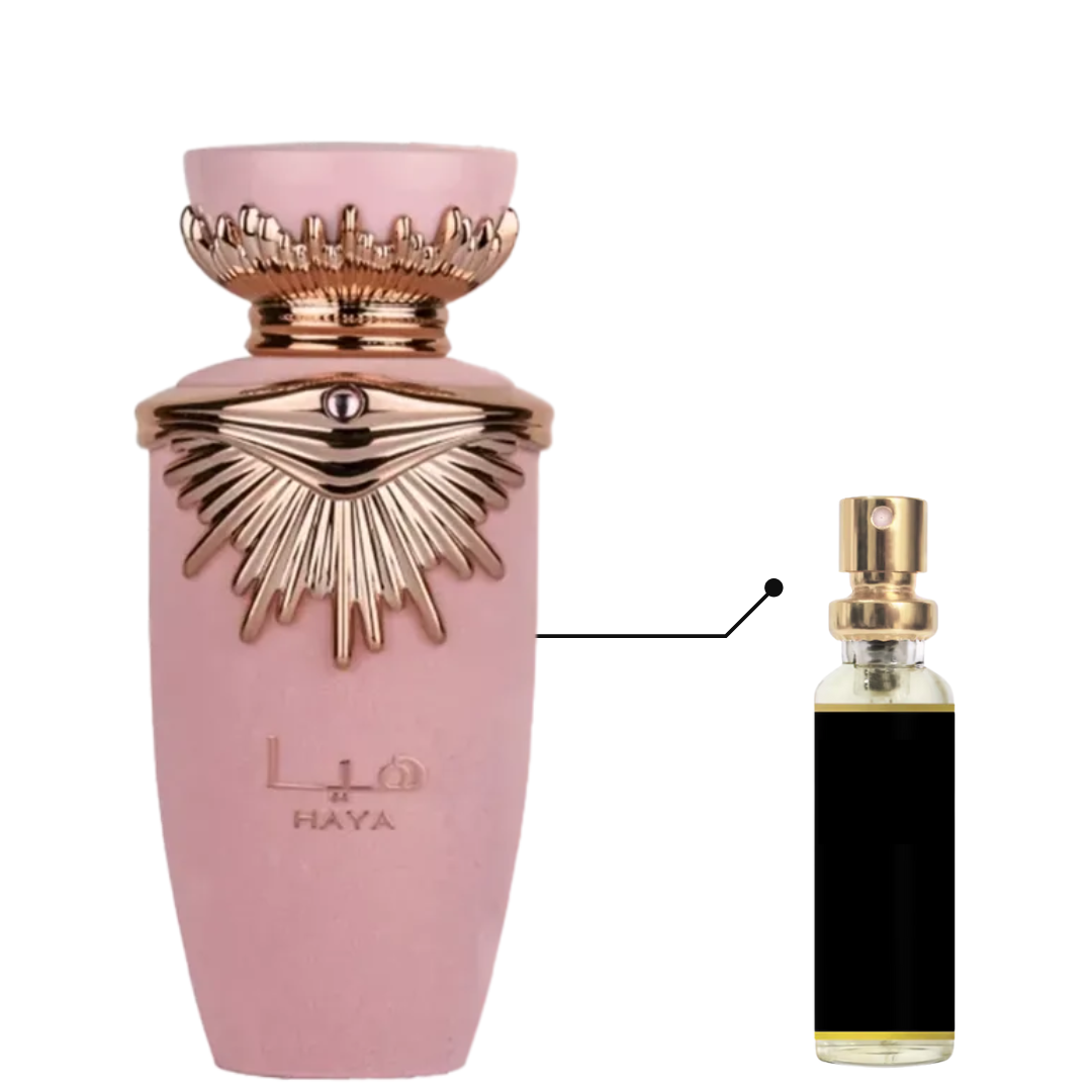 Haya de Lattafa Perfumes é um perfume Feminino. Haya foi lançada em 2022. As notas de topo são: Morango, Champanhe, Tangerina, Laranja Sanguínea e Rosa. As notas de coração são: Gardênia, Jasmim e Orquídea Baunilha. As notas de fundo são: Âmbar, Sândalo e Castanha.
